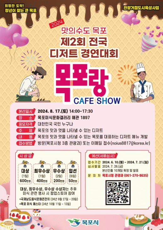 대한민국 관광거점도시 육성사업의 일환으로 올해 2회를 맞이하는 전국 디저트 경연대회 「목포랑 CAFE SHOW」는 맛의 수도 목포에 걸맞는 디저트 메뉴를 발굴하기 위한 대회로 오는 17일 목포 미식문화갤러리 해관1897에서 진행될 예정이다.
