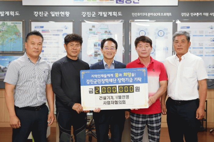 강진군 건설기계연합회는 2005년, 정식 출범 이후, 지역 인재 육성과 교육 발전을 위해 꾸준히 장학금을 강진군민장학재단에 전달해 오고 있으며, 올해도 어김없이 장학금 2백만 원을 기탁했다.