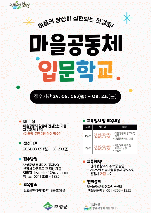 보성군은 교육을 수료한 마을을 대상으로 마을 자원 조사, 마을 회의를 거쳐 ‘2025년도 전남 마을공동체 공모사업’에 참여할 수 있도록 적극 지원할 방침이다.