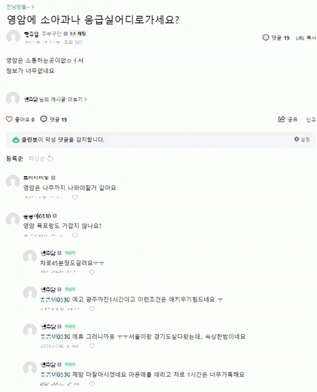 전남지역의 한 맘카페에서 오고 간 대화에는 영암에서 아이 키우기 힘든 부모의 고충이 고스란히 담겨 있다.