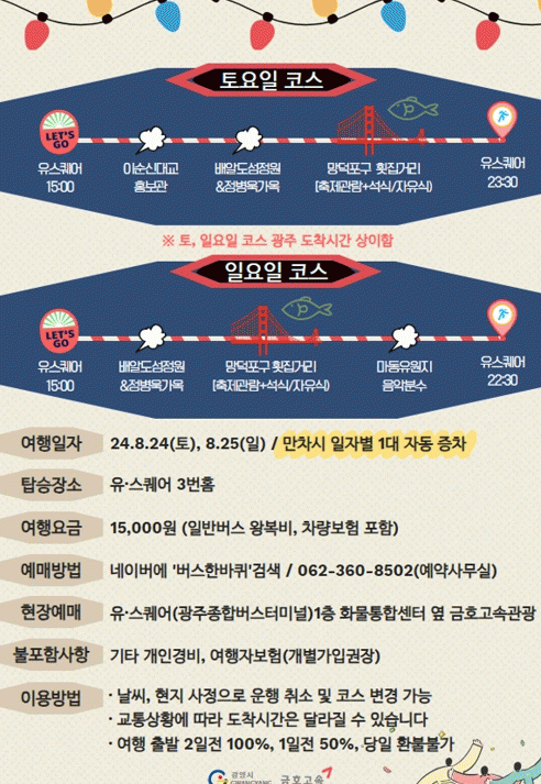 이번 8월 광양시티투어 광역코스는 출발시간과 탑승 및 하차 장소는 같지만, 투어 일정과 도착시간은 다소 상이하므로 예약 시 유의해야 한다.