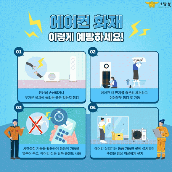 주요 예방수칙으로는 ▲전선이 손상되거나 무거운 물체에 눌리는지 점검 ▲에어컨 내 먼지를 충분히 제거 및 이상유무 점검 후 가동 ▲시간설정 기능 활용 ▲에어컨 전용 단독 콘센트 사용 ▲에어컨실외기는 통풍 가능한 곳에 설치 ▲실외기 주변은 깨끗하게 유지하는 등 생활 속 예방이 중요하다.