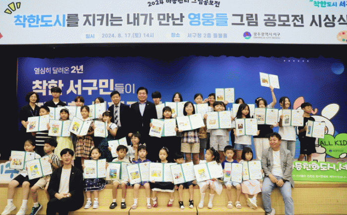 이번 공모전은 ‘착한도시 서구에서 아동의 4대 권리를 실천하고 있는, 내가 만난 영웅의 모습’을 주제로 ▲유치부 ▲초등저학년부 ▲초등고학년부 ▲중·고등부 4개 부분으로 진행됐으며 총 304건의 작품 중 내부심사 및 전문가 심사를 통해 최종 32명의 수상자가 선정됐다.