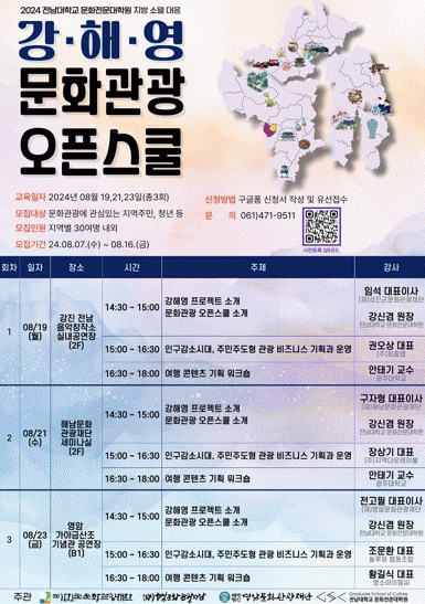 오픈스쿨은 8월19일에 강진을 시작으로 8월21일에는 해남에서 실시되고 마지막으로 8월23일에 영암에서 개최될 예정이다. 세 지역에서 강해영 프로젝트에 대한 이해를 높이고 지역주민과 청년들에게 문화관광 비즈니스 발굴 및 참여기회를 제공하는 것이 주요 내용이다.