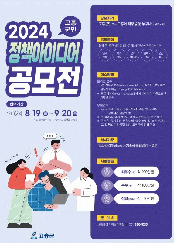 이번 공모전은 군민과 함께하는 참여 행정을 실현하고 참신한 아이디어를 발굴하여 정책에 반영하고자 진행되며, 고흥 군민뿐만 아니라 고흥에 직장을 둔 사람이라면 누구나 참여할 수 있다.