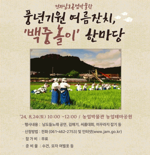김옥경 농업박물관장은 “갈수록 잊히는 백중 의미를 되새기기 위해 백중놀이 재현 행사를 마련했다”며 “이번 행사를 통해 도민이 전통 농경문화를 체험하고, 가족과 함께 특별한 추억을 만들길 바란다”고 말했다.