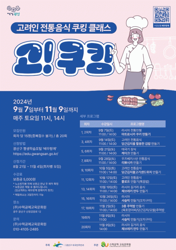 쿠킹클래스는 9월 7일부터 11월 9일까지 매주 토요일 오전 11시, 오후 2시 월곡동 고려인문화관 ‘결’과 수떡공예교육문화원에서 진행한다.