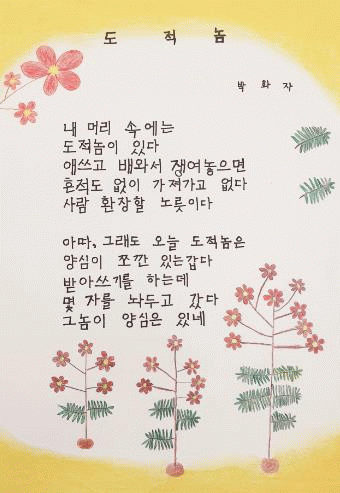 한글 공부의 고충을 해학적으로 표현해 심사위원들의 큰 호평을 받았다.