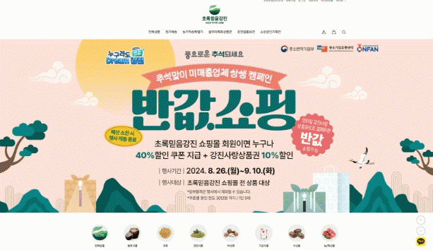 추석 명절 할인 이벤트를 통해, 초록믿음강진 쇼핑몰 모든 상품을 40% 할인된 가격으로 구매가 가능하다.
