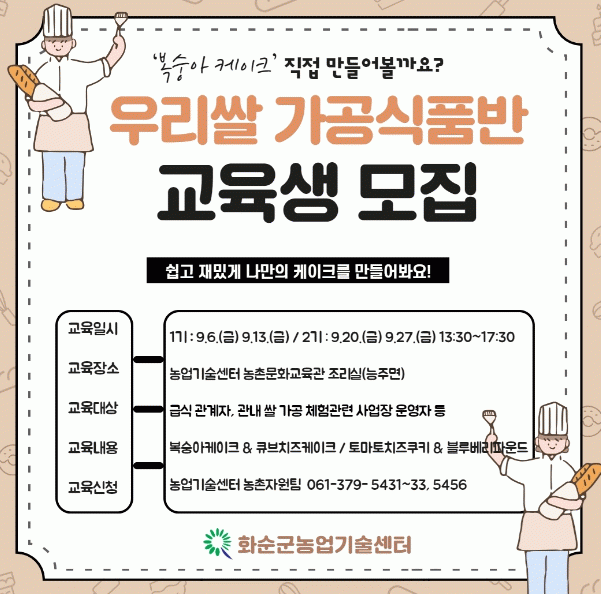 쌀 가공식품반은 9월 6일 개강하여 9월 27일까지 2기수로 운영되며, 기수별 20명씩 총 2회 4시간 진행할 예정이다.