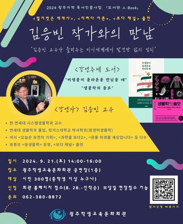 광주학생교육문화회관 정은남 관장은 “이번 강연회를 통해 지역민들이 책을 가까이하고 인문학적 감수성을 키우길 바란다”며 “지역민의 생활 속 문화 향유 기회를 제공하고 인문가치 확산을 위해 최선을 다하겠다”고 말했다.
