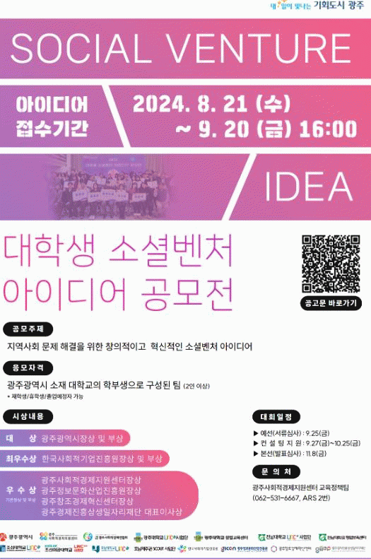 신창호 노동일자리정책관은 “이번 공모전에 지역사회문제 해결과 사회적경제 활성화를 위한 혁신적인 아이디어가 나오길 기대한다”며 “지역청년들의 적극 참여를 바란다”고 말했다.