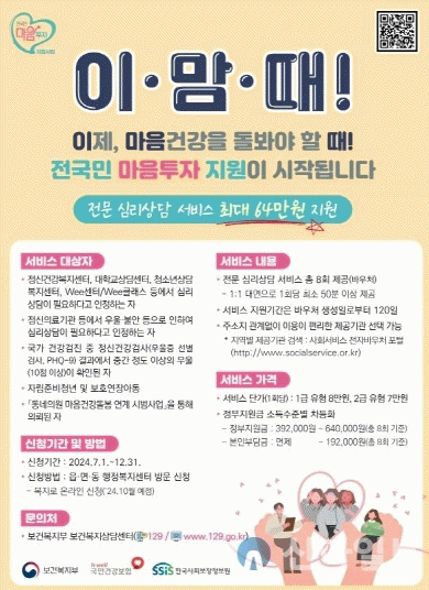 아울러 담양군은 ‘전국민 마음투자 지원사업’에 참여할 심리상담 서비스 제공기관을 연중 모집하고 있으며, 담양군보건소 정신건강복지센터를 통해 신청하면 된다.