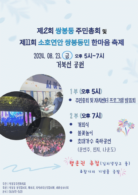 박건문 쌍봉동주민자치회장은 “올여름 더위에 힘든 시간을 보낸 주민들에게 소통과 화합, 힐링의 시간을 마련했다”며 “다양한 볼거리와 푸짐한 경품을 준비한 만큼 많은 분이 함께하기를 바란다”고 말했다.