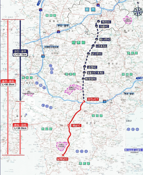 광주~완도간 고속도로 2단계 구간은 강진군 작천면에서 해남군 북평면까지 38.9km 구간으로 국비 1조 5,965억원이 투입된다.