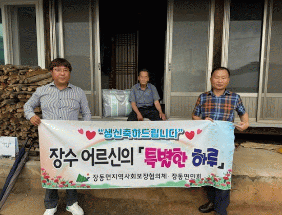 장동면민회(회장 안성호)에서 생신 케이크를 준비하고, 기타 후원 물품을 함께 전달한다.