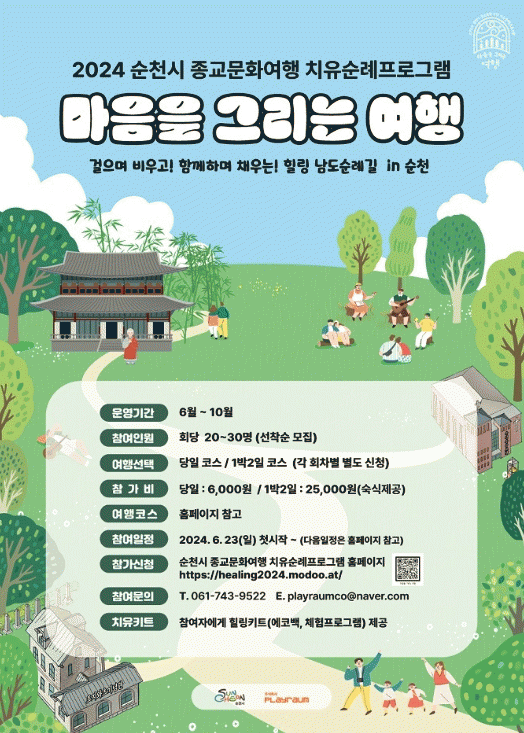 순천 종교문화여행 치유순례프로그램은 문화체육관광부가 후원하고 순천시 주최로 운영되고 있으며, 우리나라를 대표하는 삼보사찰인 송광사를 중심으로, 관내 종교유산(기독교역사박물관, 매산등 근대 유적 일원 등)을 활용한 마음 힐링 프로그램을 진행하고 있다.