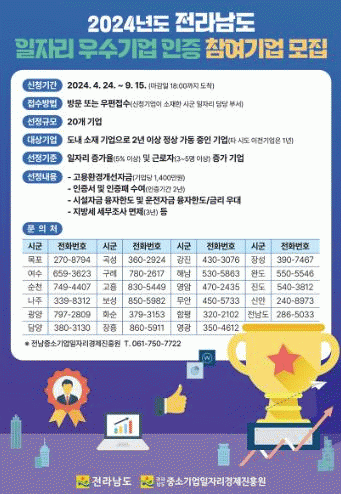 전라남도가 주관하는 ‘일자리 우수기업 인증사업’은 일자리 창출 및 근로자 고용안정에 기여한 20개 기업을 선정해 고용환경개선자금 1,400만 원을 지급하고 시설·운전자금 융자 우대, 지방세 세무조사 면제(3년) 등 각종 혜택을 지원하는 사업이다.