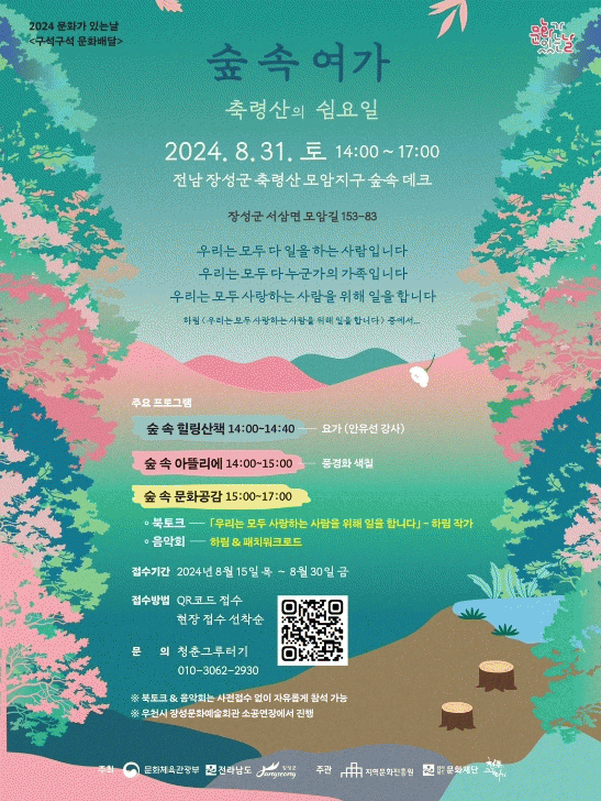 문화체육관광부와 전라남도, 장성군이 주최하고 지역문화진흥원, 전남문화재단, 장성지역 청년단체 ‘청춘그루터기’가 주관하는 ‘숲속여가’는 ‘문화가 있는 날 구석구석 문화배달사업’의 일환으로 마련됐다.