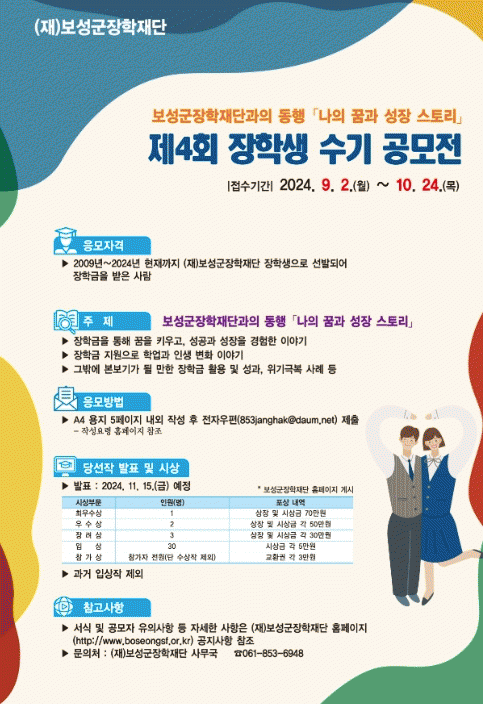 이번 공모전은 보성군장학재단의 장학금을 받은 학생들이 자신의 꿈과 성장 이야기를 공유하는 기회를 제공하기 위해 마련됐으며, 이를 통해 장학재단과 함께한 여정을 되돌아보는 의미 있는 시간이 될 것으로 기대한다.