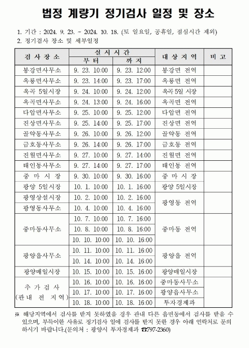 이번 정기 검사는 9월 23일 봉강면을 시작으로, 각 읍면동사무소에서 순차적으로 진행하며 지정 날짜에 검사하지 못한 경우 다른 읍면동 검사 장소에서 검사받을 수 있다.