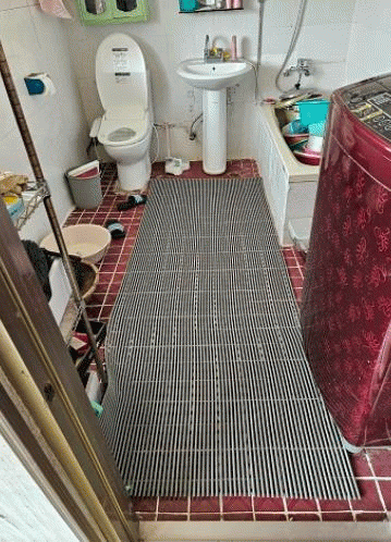 이 매트는 노인 복지용구로 욕실 내 신발 없이 다닐 수 있고, 비눗물이 바로 빠르게 빠져 미끄럽지 않고, 겨울에도 푹신하다는 장점이 있다.