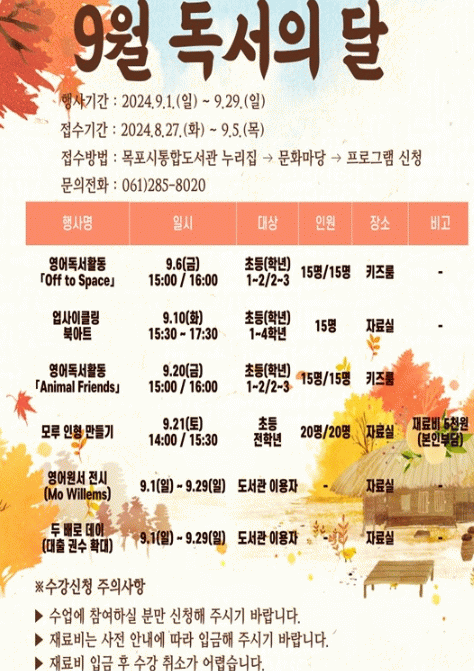 프로그램 접수는 현재 선착순 모집중으로, 오는 9월 5일 오후 6시까지 목포시통합도서관 누리집에서 신청하면 된다.