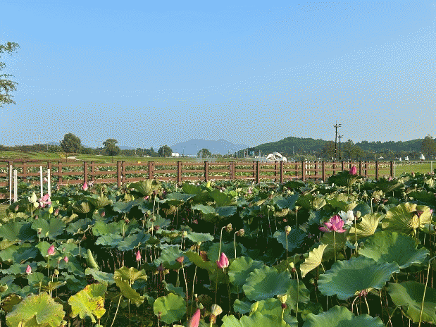 여름 끝자락에 선 지금, 연못 가득 수려하게 핀 연꽃과 선선한 가을바람을 기다리며 살랑거리는 팜파스그라스가 이루는 모습은 장관을 이루고 있다.