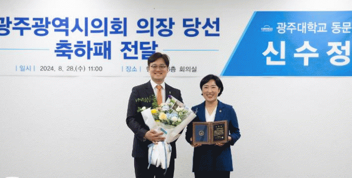 광주대학교는 신수정 의장이 광주광역시의회 개원 34년 만에 여성 최초로 의장으로 선출돼 광주대인(산업디자인학과 96년 졸업)의 긍지를 드높이고 모교의 명예를 빛낸 공을 치하하며 축하패를 전달했다.