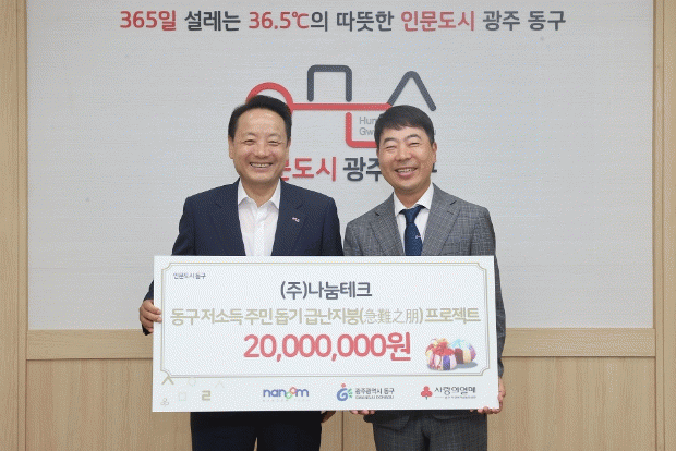 동구는 ㈜나눔테크가 기탁한 성금은 저소득 취약계층 주민을 위한 복지 사업비로 사용할 예정이다.