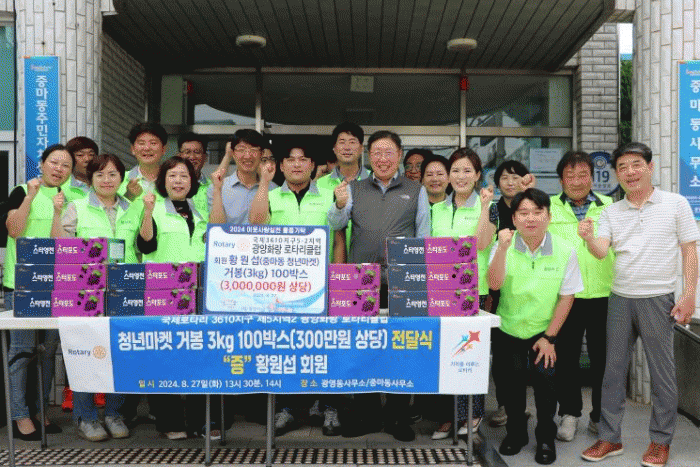 거봉 50박스는 광양화랑로타리클럽 회원인 황원섭 청년마켓 대표의 후원으로 마련한 물품으로 중마동 관내 어려운 이웃과 요양원 등 복지 시설에 전달될 예정이다.