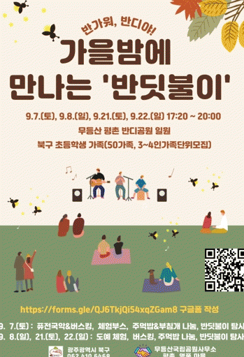 또한 애반딧불이 유충 방생 행사는 9월 8일 충효동 121-7번지 일원에서 반딧불이 이끼 화분 만들기, 반딧불이 엽서 만들기 등 반딧불이와 관련된 다양한 체험 부스가 오후 4시부터 5시까지 운영되고 이어서 애반딧불이에 대한 설명을 40분간 들은 후 유충을 방생하고 애반딧불이 개체 수 확대를 기원할 계획이다.