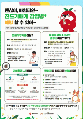 배강숙 공공보건의료과장은 “진드기 매개 감염병 예방을 위한 가장 효과적인 방법은 진드기에 물리지 않는 것”이라며 “벌초·성묘 등 야외활동이 증가하는 가을철에는 야외활동 예방수칙을 준수해 주길 바란다”고 당부했다.