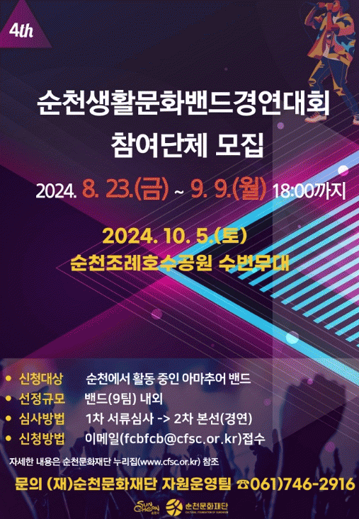 또한, 순천에서 활동 중인 아마추어밴드를 대상으로 순천생활문화밴드경연대회 참여단체도 모집한다.
