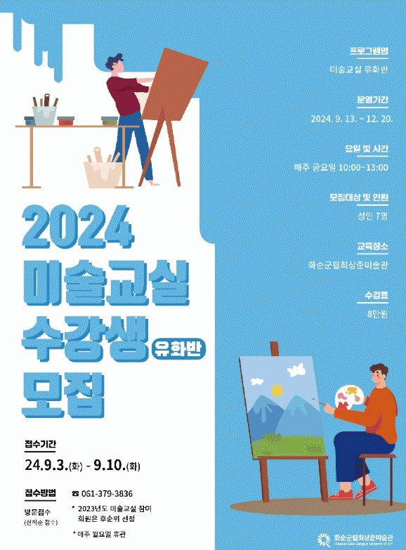 수강 신청접수 기간은 9월 3일(화)부터 9월 10일(화)까지이며, 미술에 관심 있는 관내 주민(만 20세 이상)은 누구나 신청할 수 있다. 모집 수강생은 7명으로, 수강료는 8만 원이다.