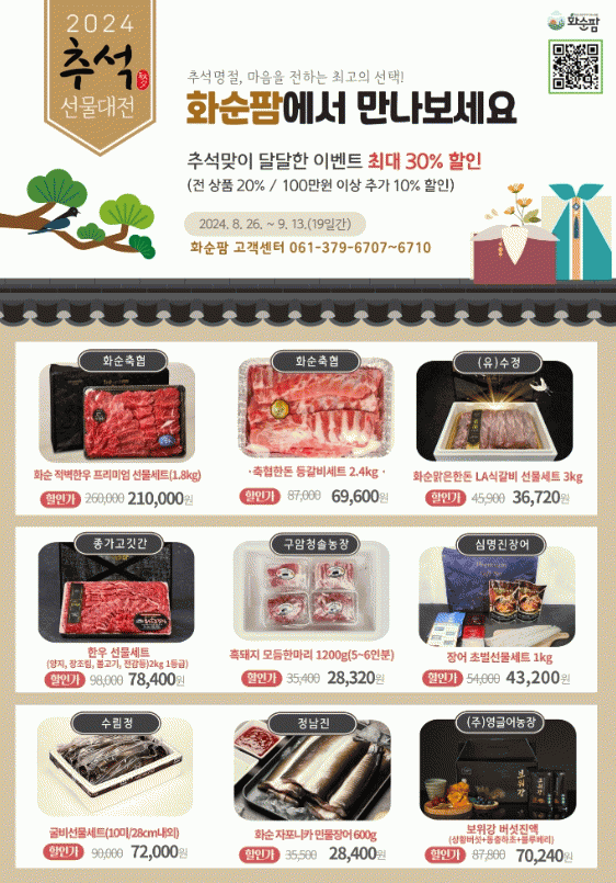 구현진 농촌활력과장은 “화순팜 우수 농특산물 및 화순쌀 소비 촉진 이벤트를 통해 화순군 농가의 소득 증대에 기여하고자 한다”라며, “올해 추석 선물은 다양한 추석 이벤트를 준비한 화순팜을 적극 애용해 주시길 바란다.”라고 말했다.