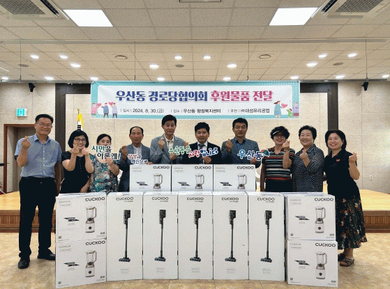 정강균 우산동 경로당협의회장은 “경로당에 꼭 필요한 물품을 후원해 준 대성유리공업 대표님께 감사하다”며 “앞으로 지역 어르신들을 위해 행복한 경로당 만들기에 지속적인 관심 부탁드린다”고 말했다.