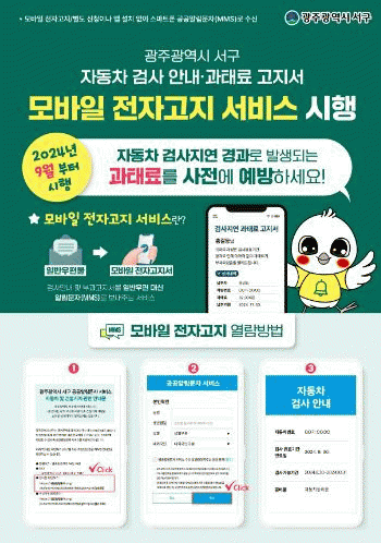서구는 기존에 등기우편으로 전달했던 자동차 검사 사전·경과, 검사지연 과태료 부과 안내를 차량 소유자 명의의 휴대전화로 안내한다고 밝혔다.