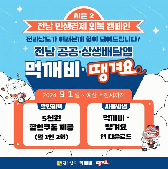 전남도는 지난 7월 18일부터 8월 31일까지 공공·상생배달앱 민생경제 회복캠페인 시즌1을 추진했다. 소비자에게 매월 1인 4회 5천 원 할인쿠폰을 제공한 결과 캠페인을 추진하지 않았던 6월보다 배달앱 매출액이 먹깨비 125%, 땡겨요 163%가 증가했다.