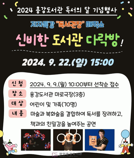 김미라 도서관과장은 “9월 독서의 달을 맞이해 각 도서관에서 다채로운 공연을 준비했다”라며 “용강도서관에서 진행하는 프로그램에 참여하셔서 가족과 함께 즐거운 한때를 보내시기를 바라고 도서관은 앞으로도 여러 흥미로운 프로그램들을 마련하겠다”라고 말했다.