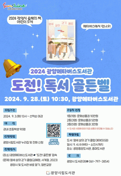 참여 신청은 9월 3일부터 전화와 광양시립도서관 누리집을 통해 가능하며 독서 골든벨 신청자는 9월 4일부터 한 달간 '열세 살의 걷기 클럽'을 선착순으로 특별대출 할 수 있다.