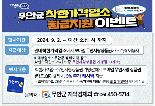 한편 무안군은 매월 첫째 주 금요일을 ‘착한가격업소 이용의 날’로 지정하여 운영하는 등 착한가격업소 이용 활성화를 위한 시책을 지속해서 추진하고 있다.