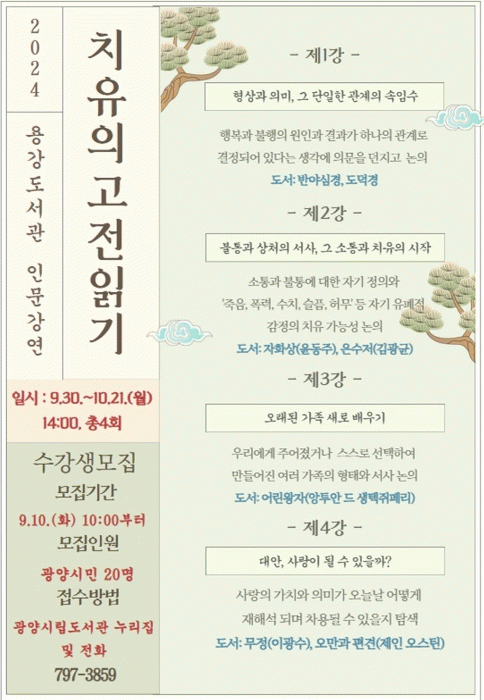 마음 인문 약방'치유의 고전 읽기'에 대한 내용은 광양시립도서관 누리집(홈페이지)을 방문하거나 전화로 문의하면 자세히 알 수 있다.