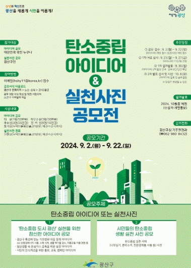 ‘탄소중립 아이디어 공모전’은 탄소중립 도시 광산 실현을 주제로 △기후변화 대응 정책 △일상생활 속 온실가스 감축 △시민인식개선 홍보·교육·캠페인 아이디어 등을 제안받는다.