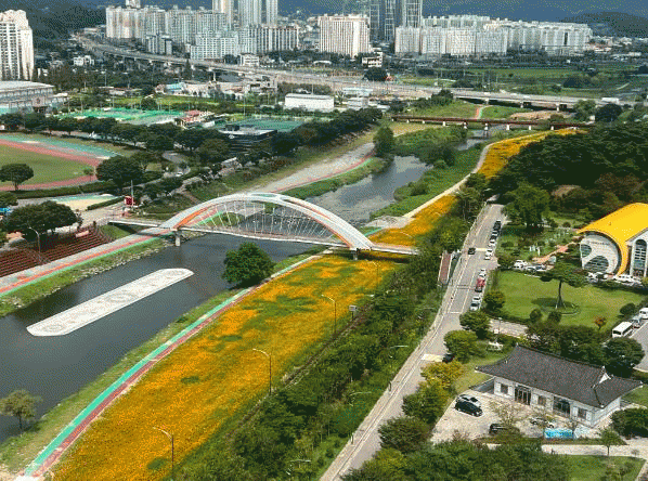 이번 화순천 가을 꽃강길은 음악분수부터 학사리보, 벌고천까지 이어지며 지난 8월에 파종한 노란 황화코스모스와 분홍색의 왜성코스모스가 풍성한 경관을 선사하고 있다.