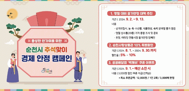 한편, 시는 풍성한 한가위를 위해 순천사랑상품권 10% 특별할인을 30일까지 진행하고, 예산 소진 시까지 공공배달앱 ‘먹깨비’에서 1인 2회, 3,000매 한정으로 3,000원 할인 쿠폰을 선착순 제공한다.