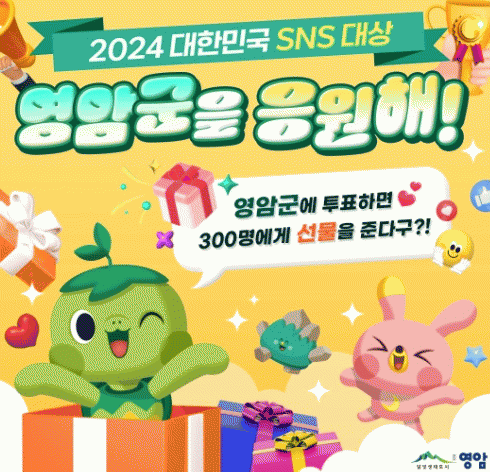 오병준 영암군 군정홍보과장은 “SNS 채널에서 다양한 주민의 참여로 만든 콘텐츠를 제작해 즐겁게 소통하는 일을 꾸준히 이어오고 있다. 대한민국 SNS 분야 최고 지자체로 선정되도록 투표와 이벤트에 많은 관심과 참여 바란다”고 전했다.