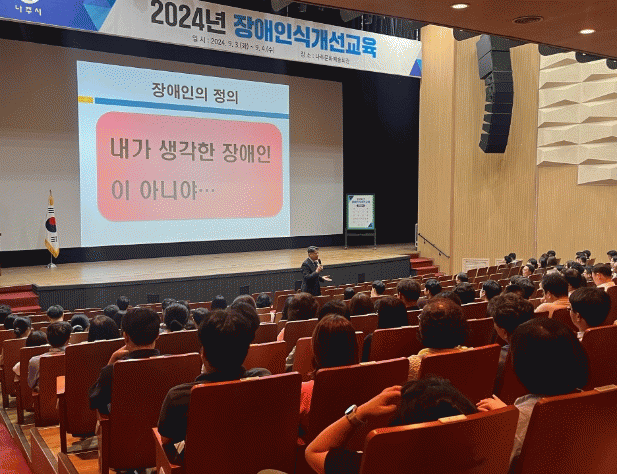 나주시 공무원과 공무직, 기간제 근로자 등 2100여 명의 공직자는 9월 3일부터 4일까지 2일간 총 4회에 걸쳐 나주문화예술회관에서 ‘2024년 장애인식개선 교육’을 받았다.
