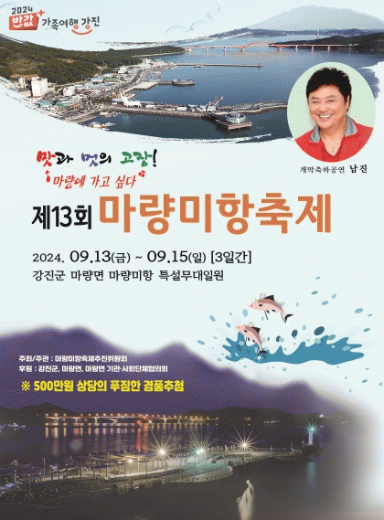정삼균 마량미항축제추진위원장은 “마량미항축제는 대한민국 최고의 가수인 남진과 20명의 가수를 초청, 축제를 하며 특히 반값 강진여행을 활용하면 보다 유익하고 즐거운 시간이 될 것”이라고 말했다.