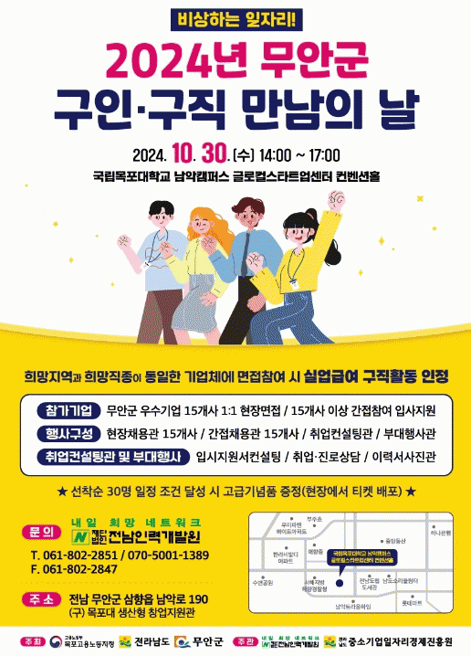 ‘비상하는 일자리’라는 슬로건으로, 무안군과 고용노동부 목포지청, 전라남도가 주최하고, 전남인력개발원, 전남중소기업일자리경제진흥원이 주관하는 이번 행사는 기업체-구직자 간 매칭을 통해 다양한 직종에 취업 기회를 제공하는 장이 될 전망이다.